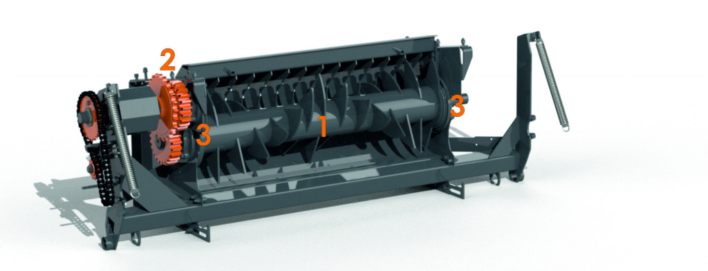 - Оснащен мощной и надежной кинематической схемой (шестеренная пара (2), опорные подшипники ротора (3) с принудительной дистанционной смазкой).