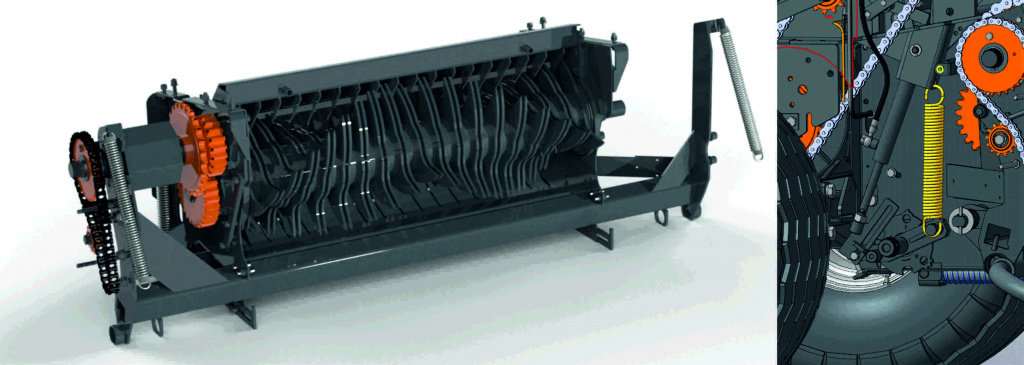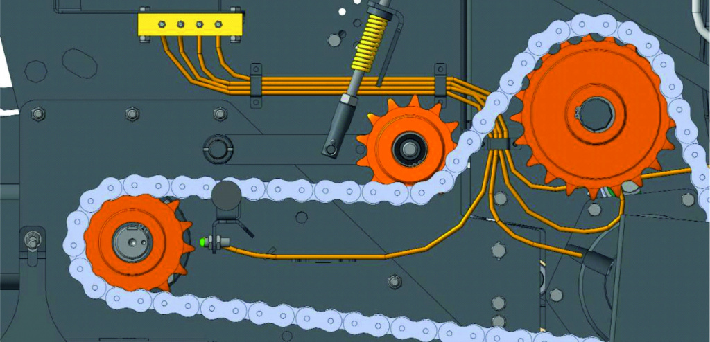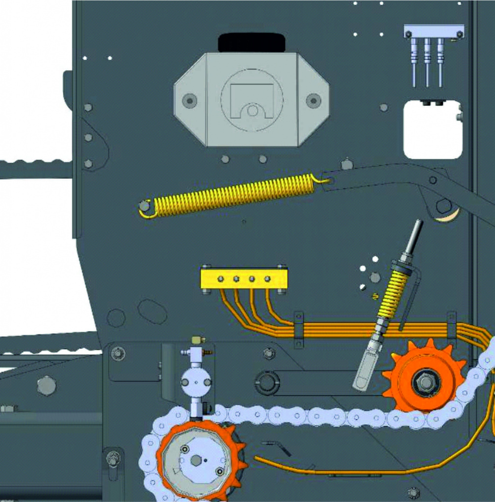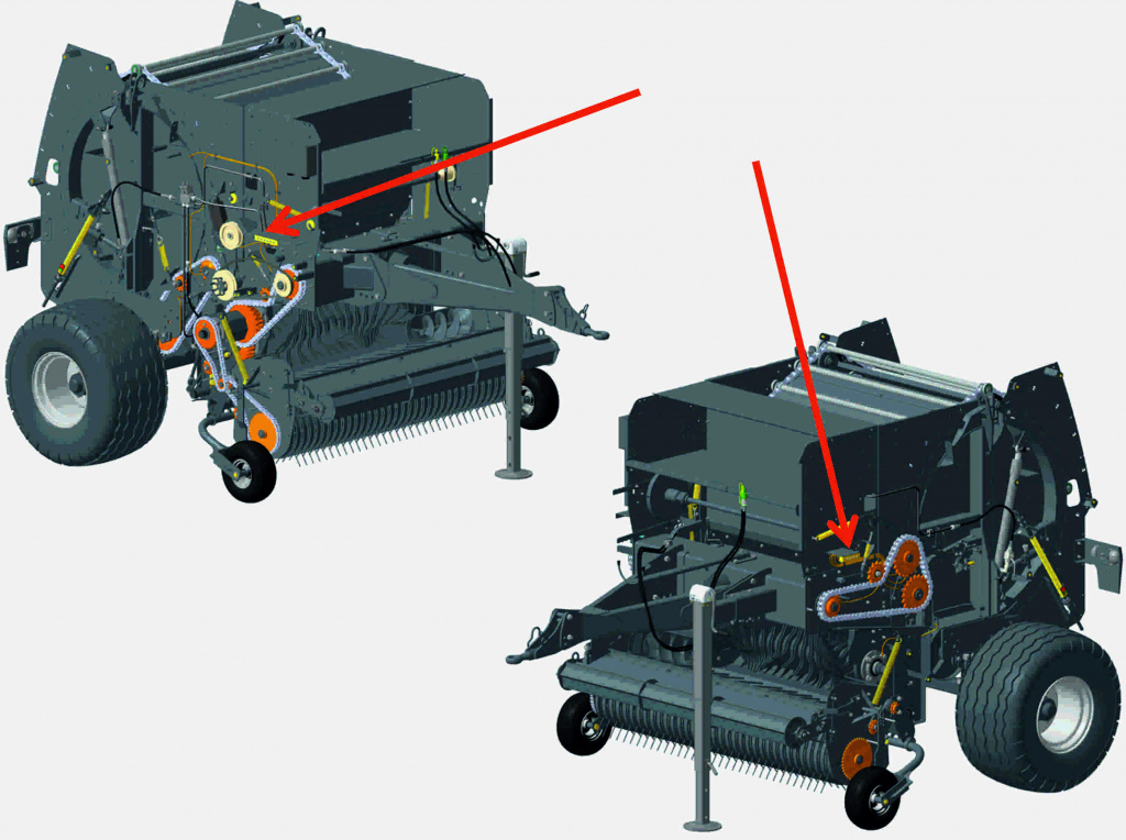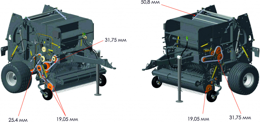 Распределение нагрузки двухсторонним редуктором позволило снизить нагрузку на цепные приводы, подшипники и валы, что продляет срок службы всех приводных узлов пресс-подборщика.
