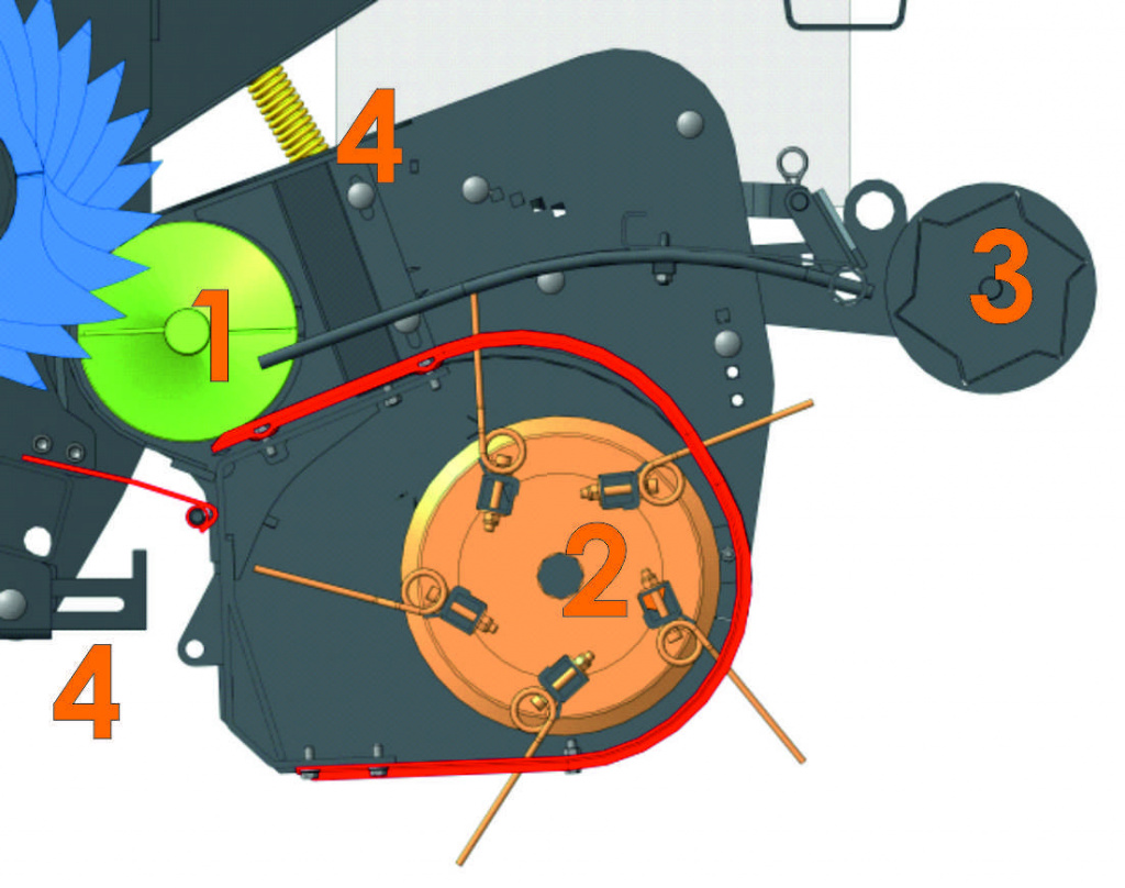 - Копирующий аппарат имеет 4 разгрузочных пружины и 2 пневмоколеса, что позволяет повысить качество корма, не подбирая почву и другие посторонние предметы, и предохранить подборщик от поломок из-за неровных полей. (4)