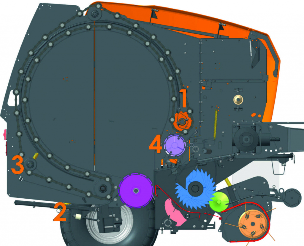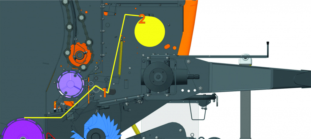 - Подача сетки непосредственно в камеру прессования, что полностью исключает риск наматывания сетки в подборщик.