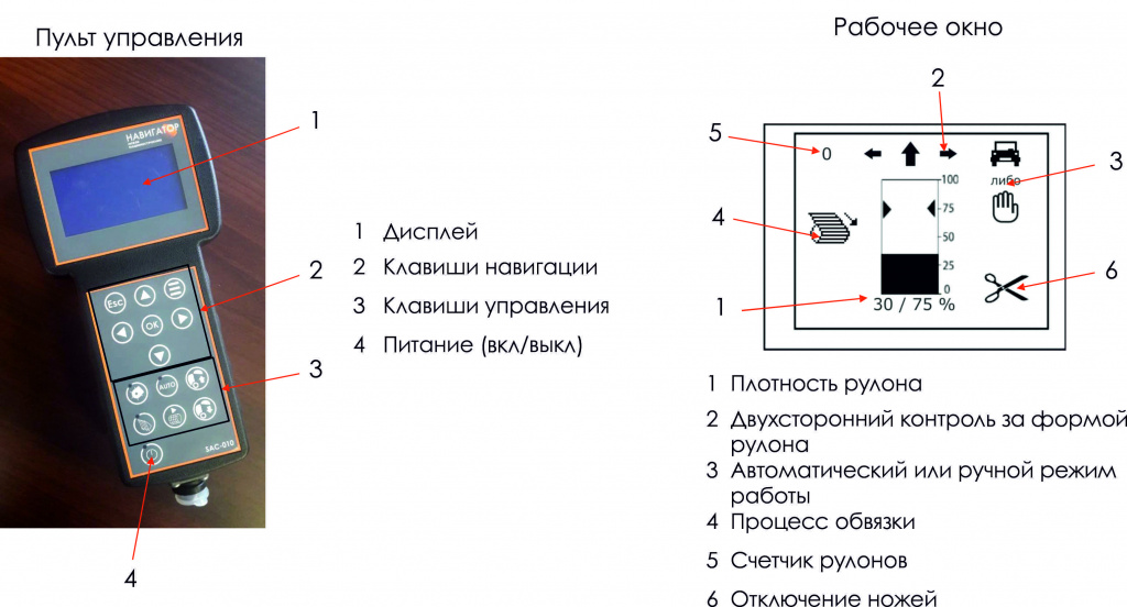 - Двухсторонний контроль за формой рулона (подсказывает механизатору держаться левее или правее)